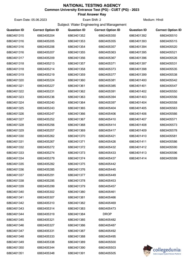 | CUET PG Water Engineering and Management Question Paper 2023 PDF | CUET PG Water Engineering and Management Answer Key 2023 PDF |