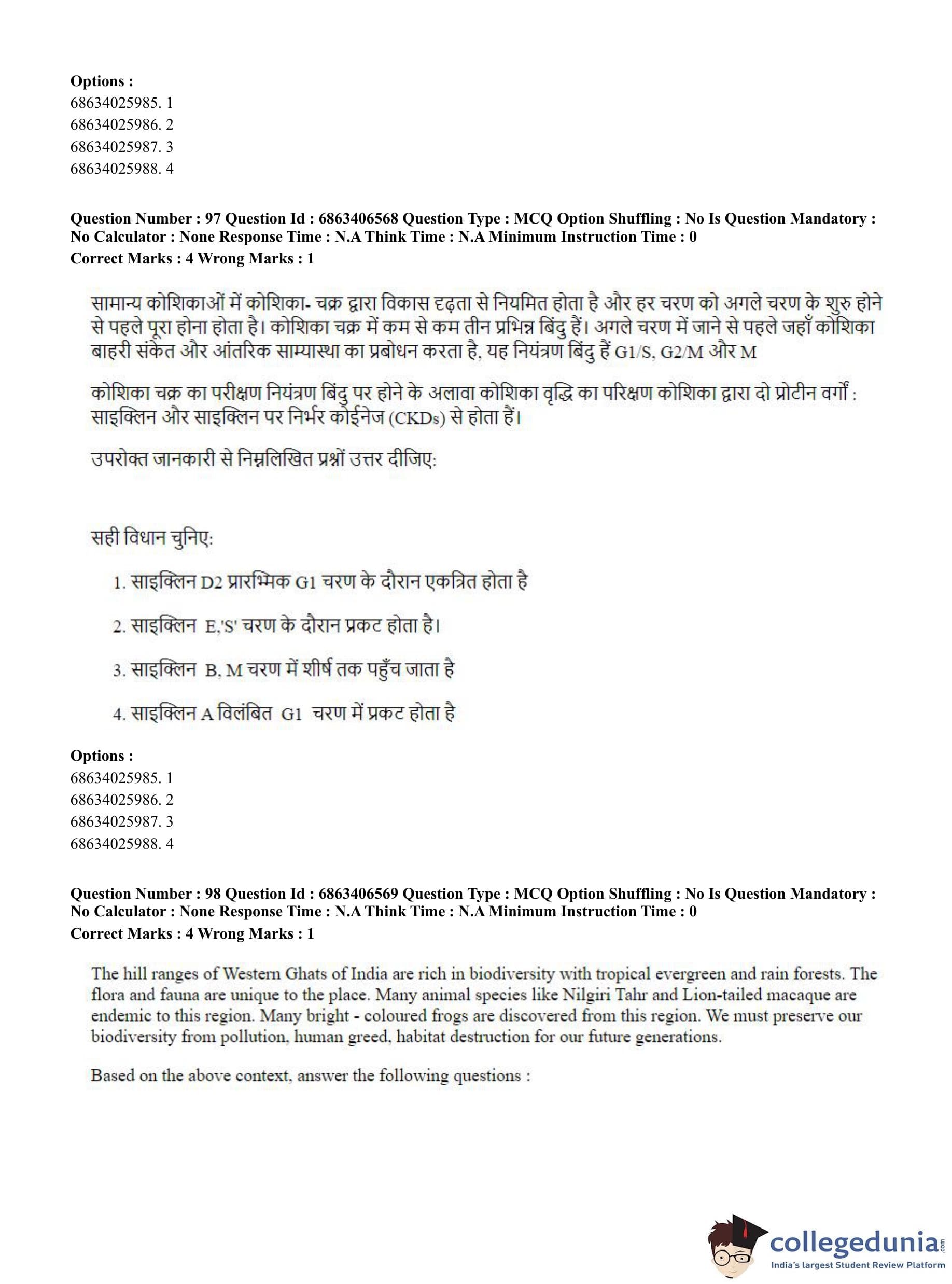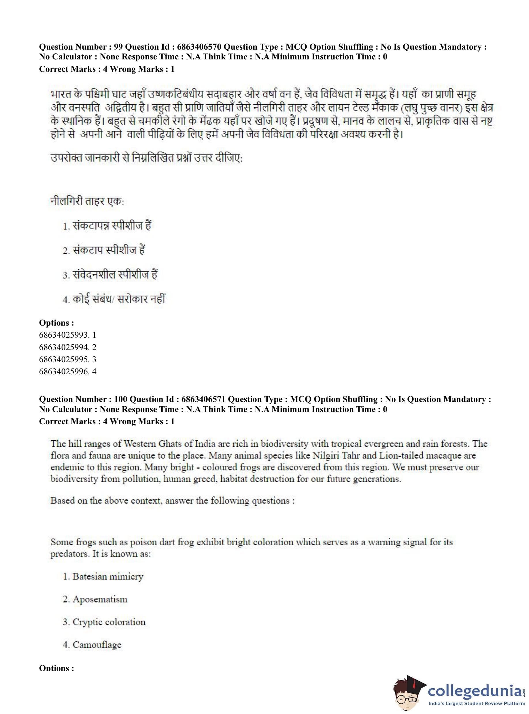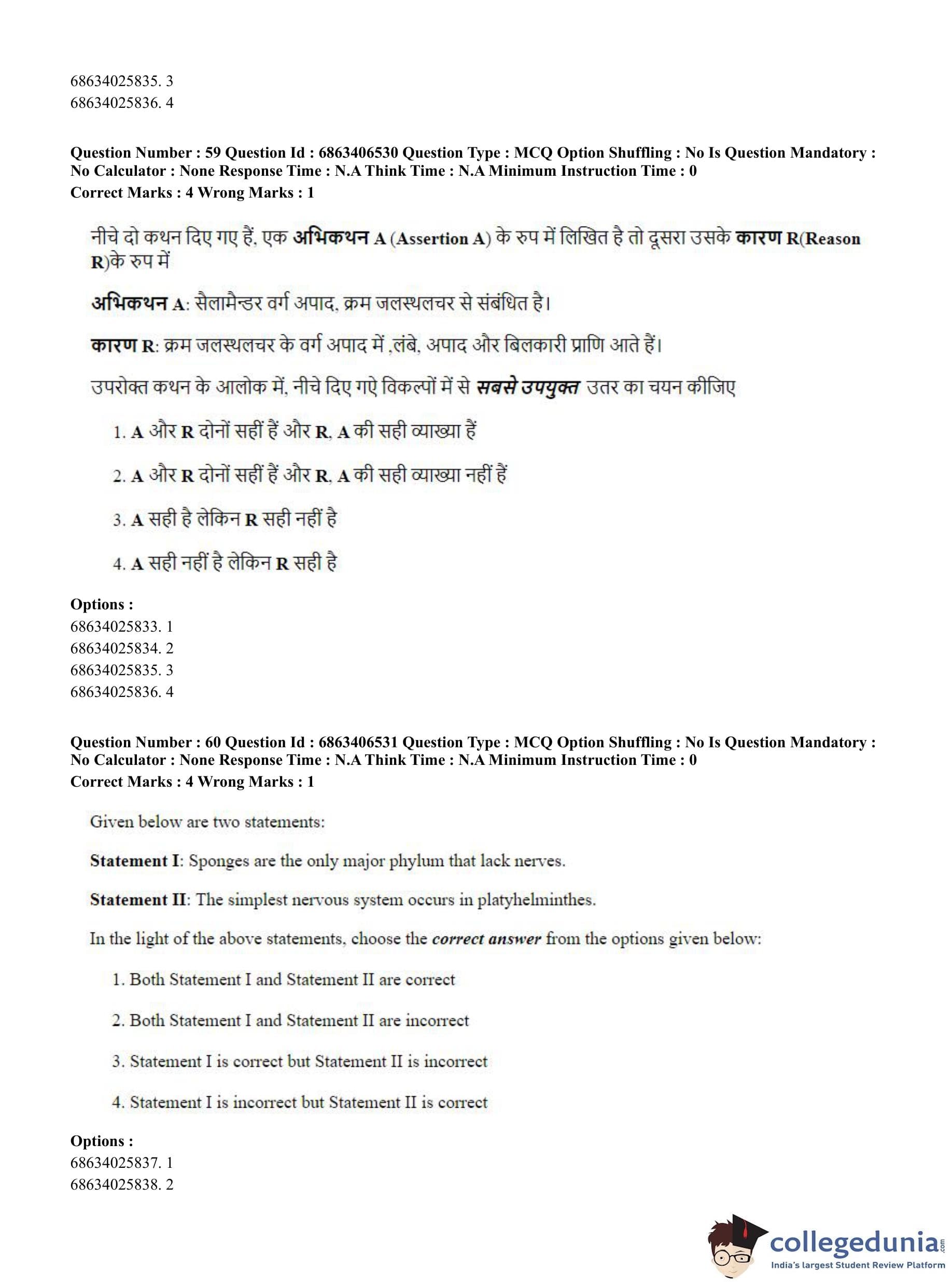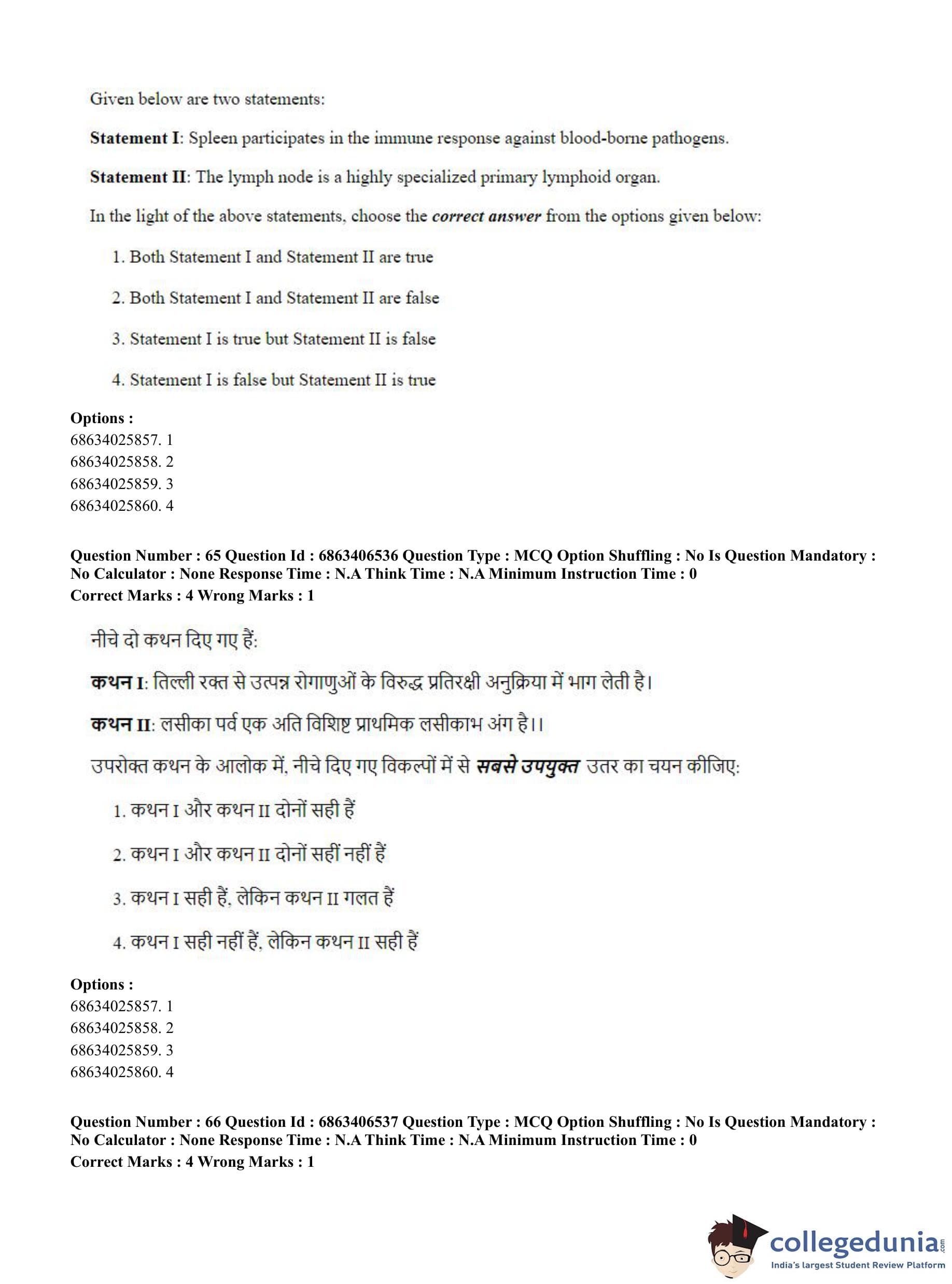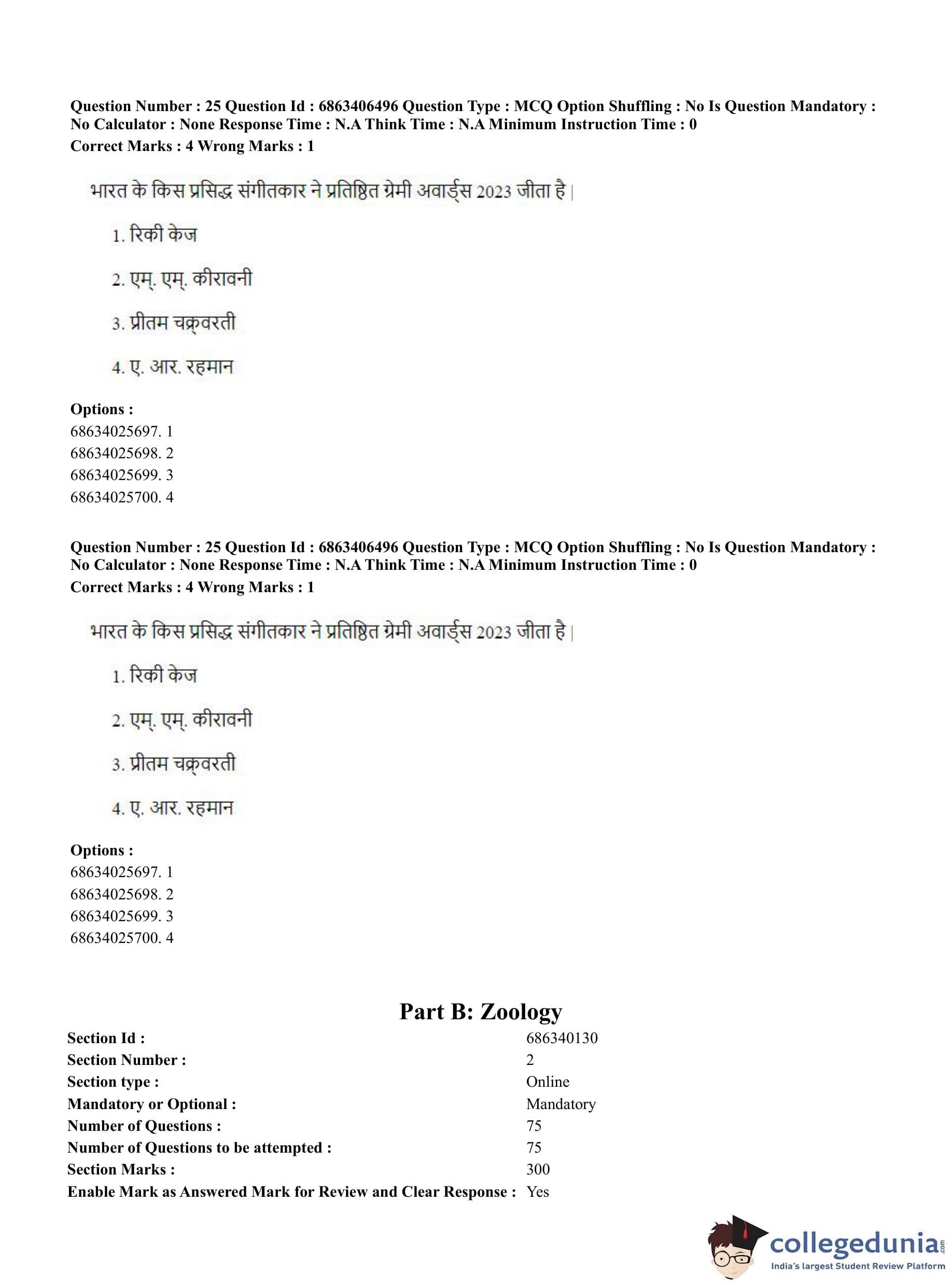 CUET PG 2023 Zoology Question Paper in Hindi (June 5 - Shift 3)
