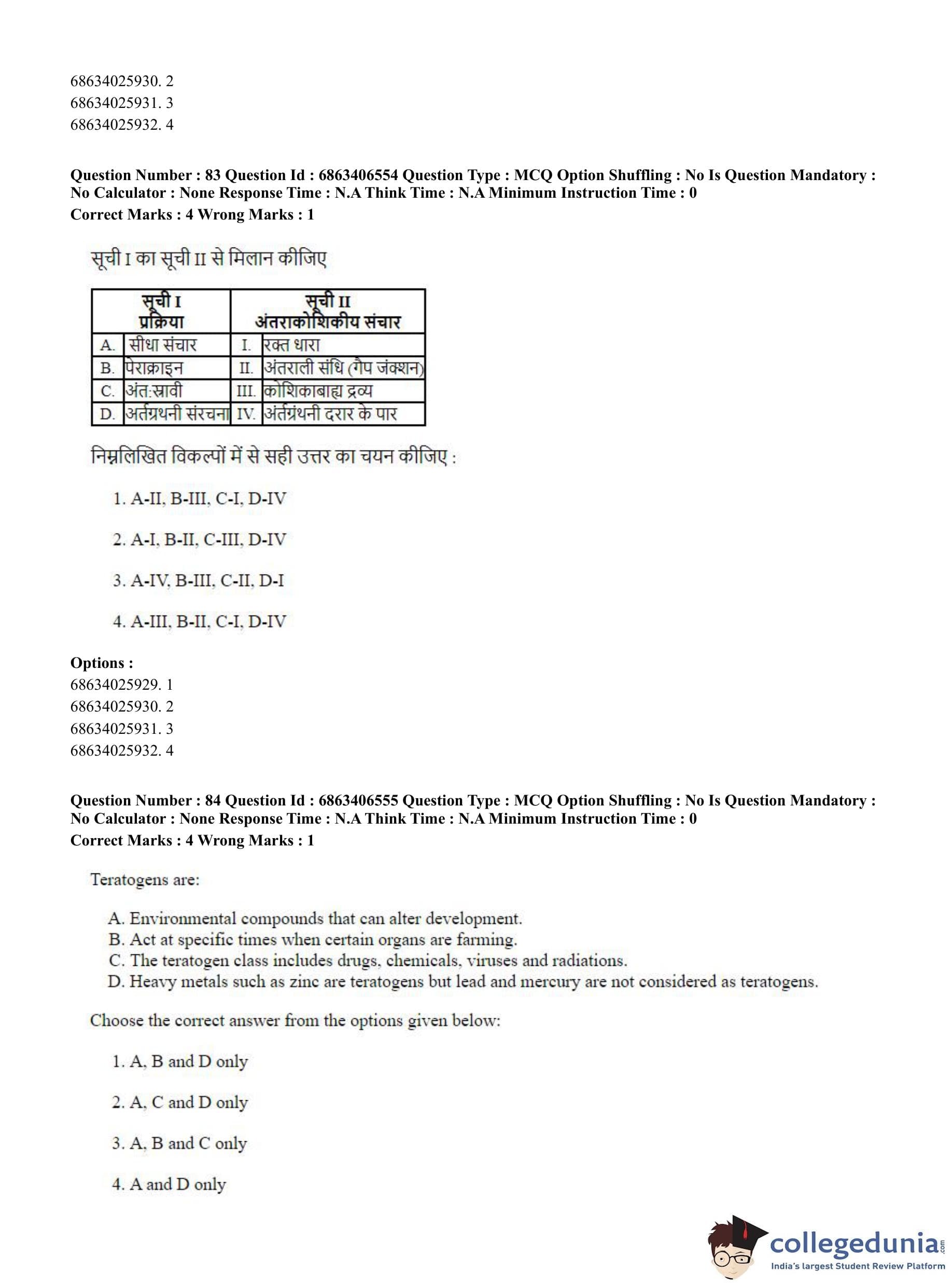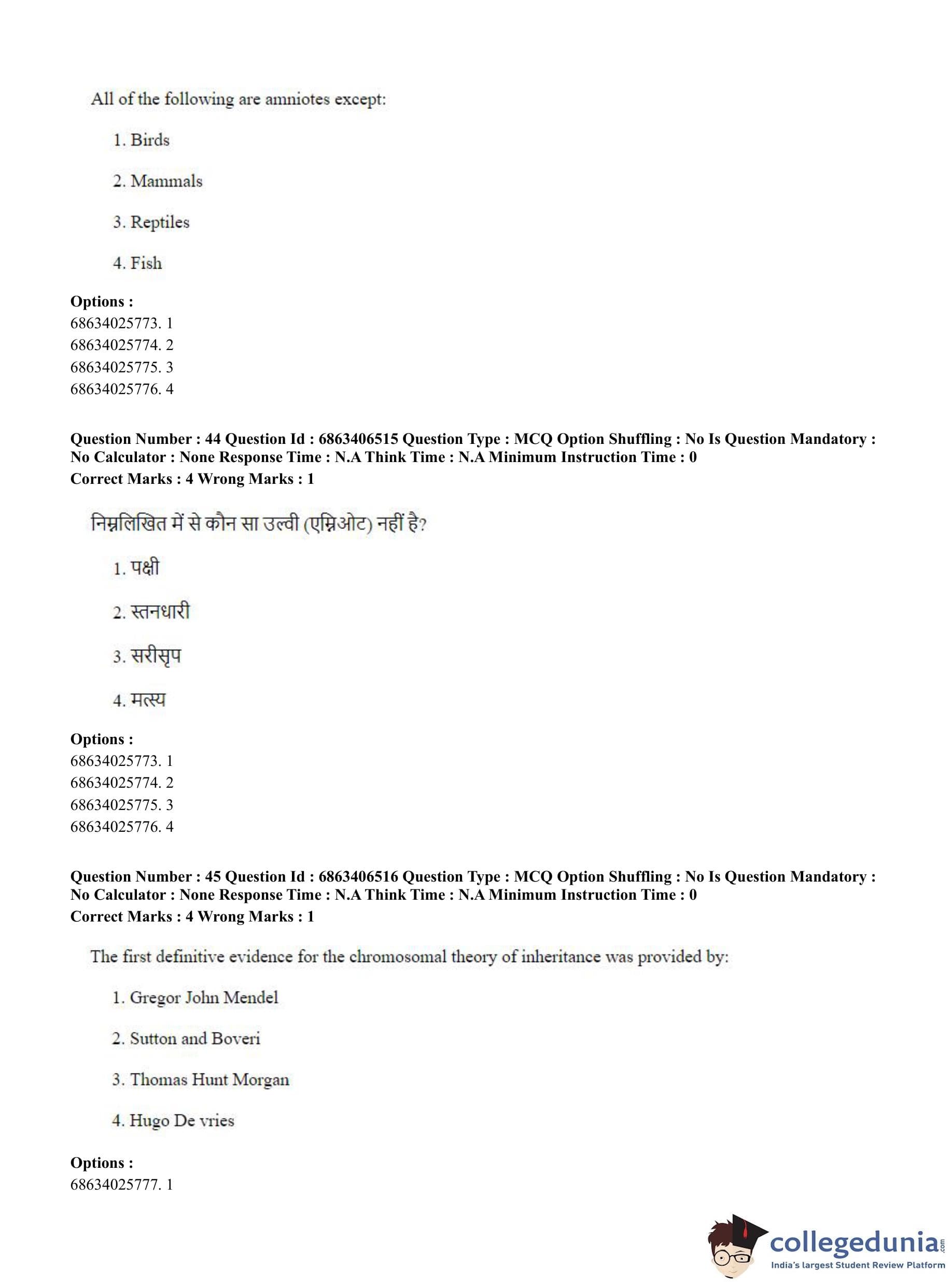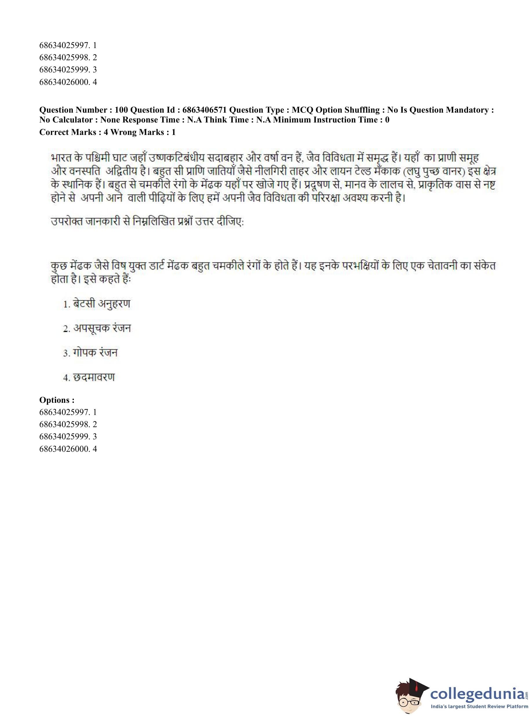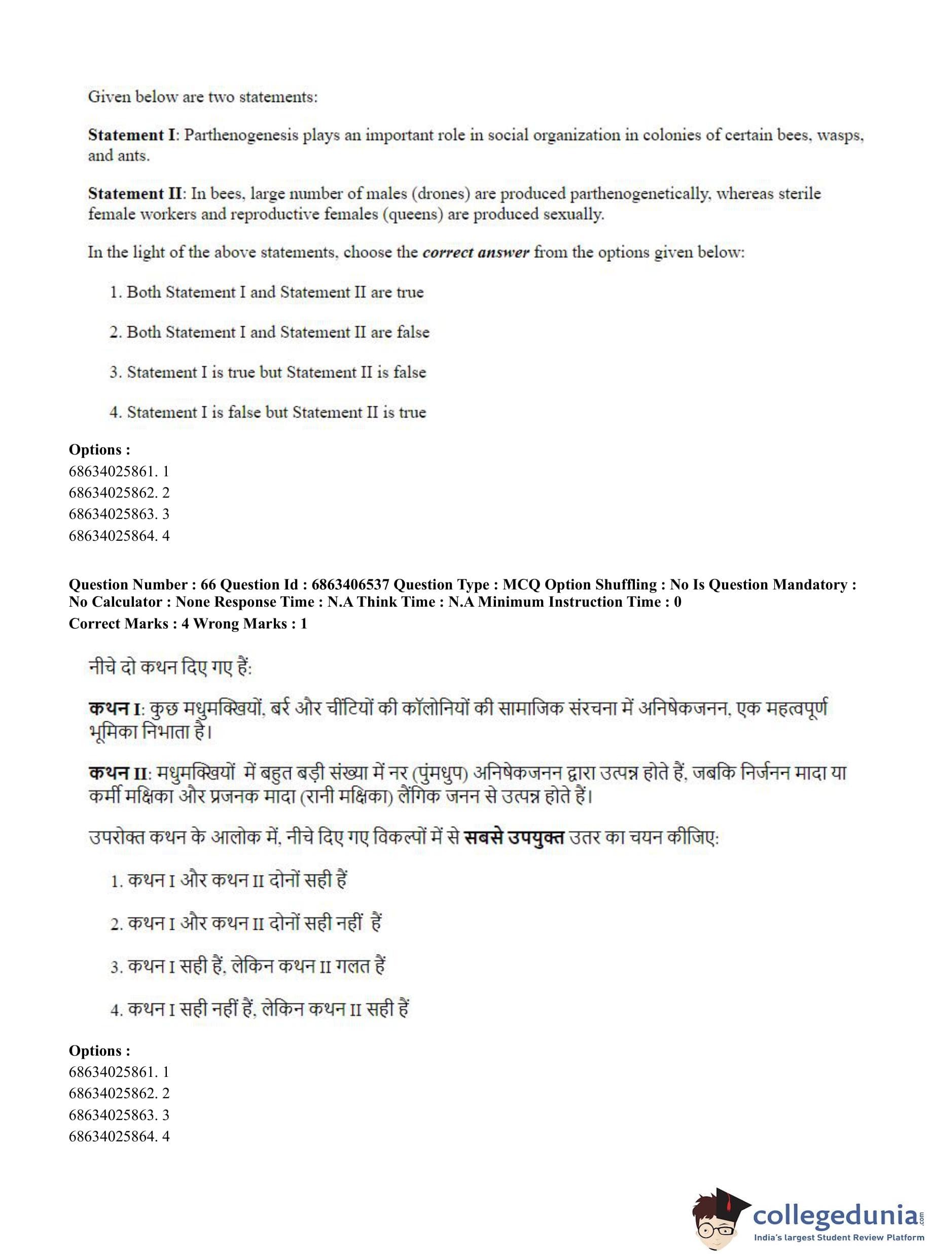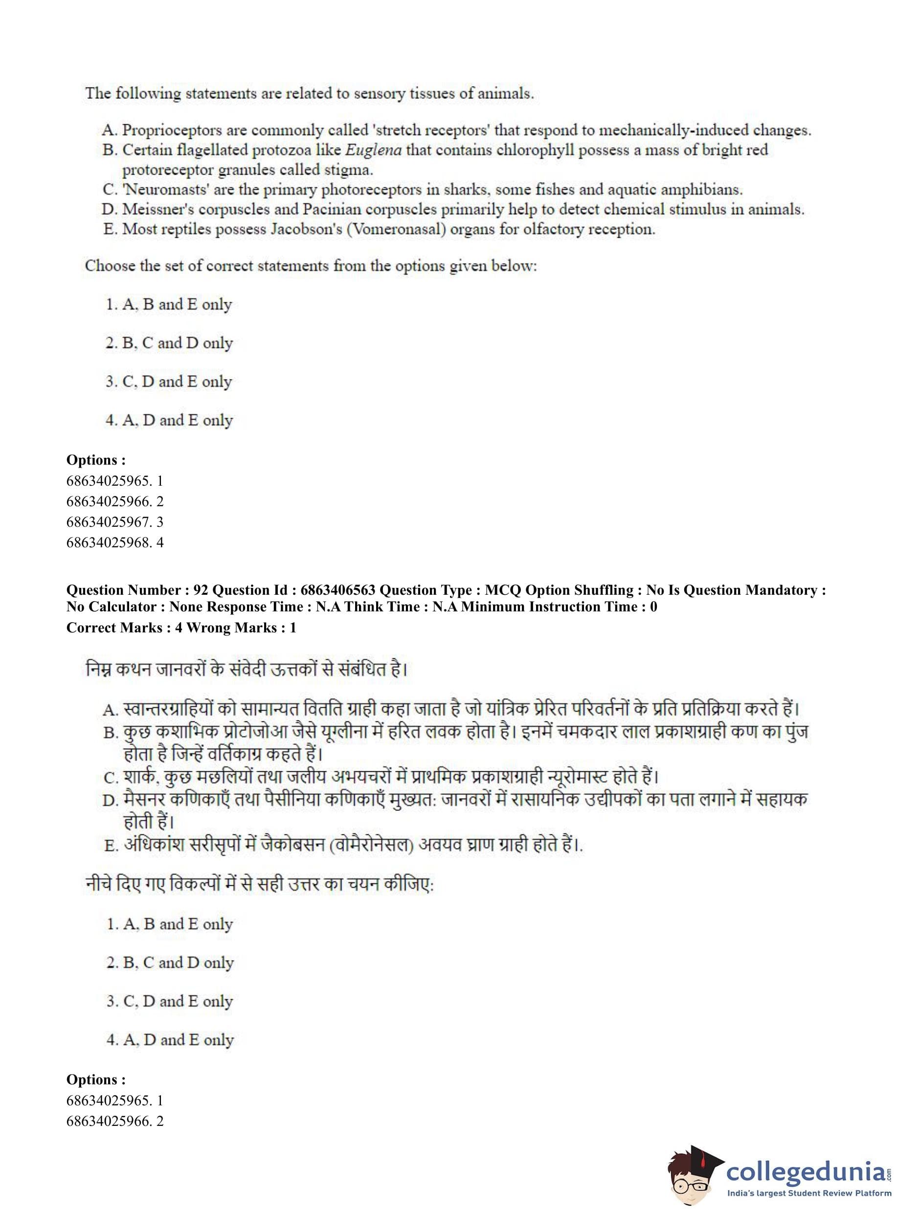 CUET PG 2023 Zoology Question Paper in Hindi (June 5 - Shift 3)