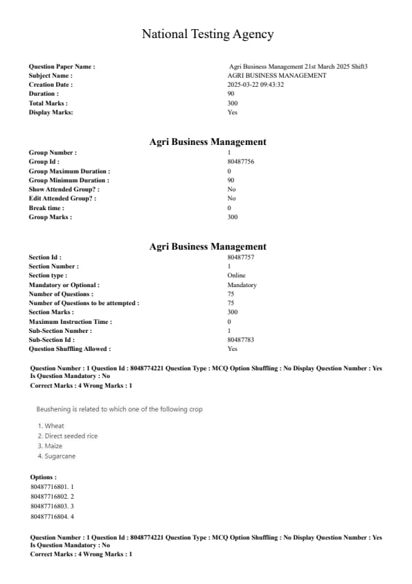 CUET PG Agri Business Management Question Paper 2025 will be available here for download. NTA conducted CUET PG Agri Business Management paper 2025 on March 21 in Shift 3. CUET PG Question Paper 2025 is based on objective-type questions (MCQs). According to latest exam pattern, candidates get 90 minutes to solve 75 MCQs in CUET PG 2025 Agri Business Management question paper.
