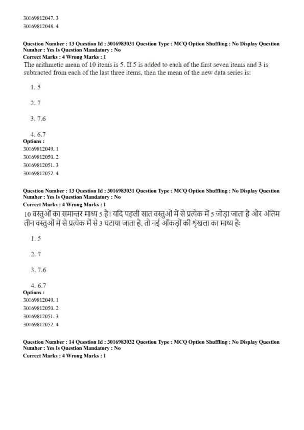 The arithmetic mean of 10 items is 5. If 5 is added to each of the first seven items and 3 is subtracted from each of the last three items, then the mean of the new data series is: