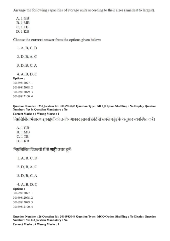Arrange the following capacities of storage units according to their sizes (smallest to largest)