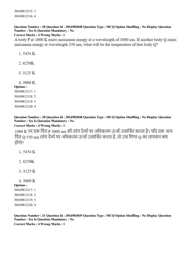 A body P at 1000 K emits maximum energy at a wavelength of 3000 nm. If another body Q emits maximum energy at wavelength 550 nm, what will be the temperature of that body Q?