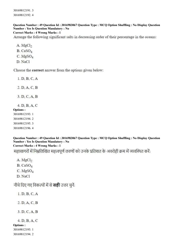 Arrange the following significant salts in decreasing order of their percentage in the oceans: