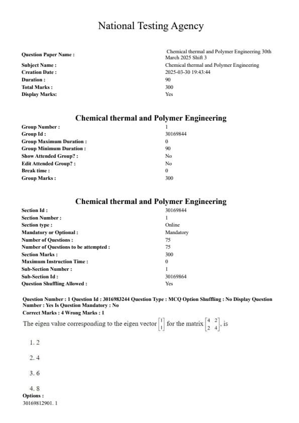 CUET PG Chemical, Thermal, and Polymer Engineering 2025 Question Paper with Answer Key PDF