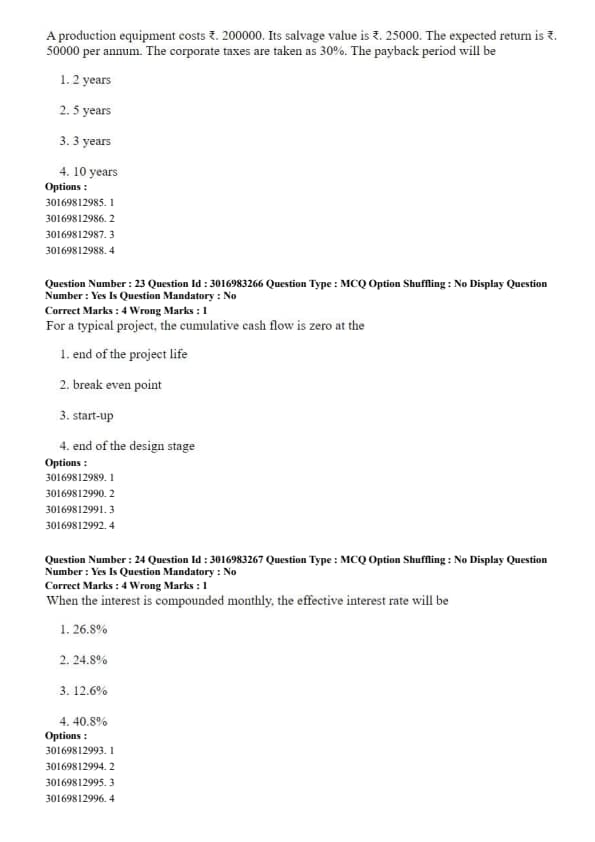 A production equipment costs ₹200000. Its salvage value is ₹25000. The expected return is ₹50000 per annum. The corporate taxes are taken as 30%. The payback period will be: