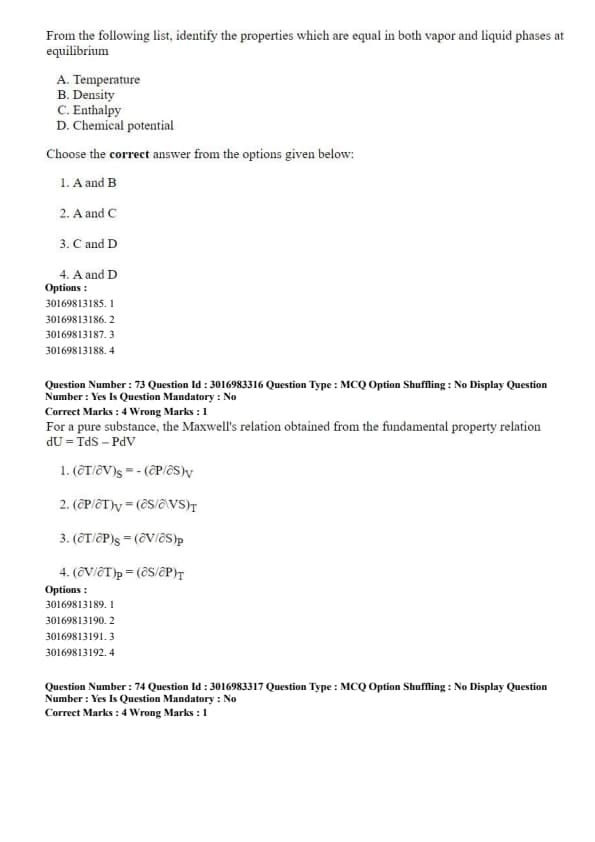 From the following list, identify the properties which are equal in both vapor and liquid phases at equilibrium: