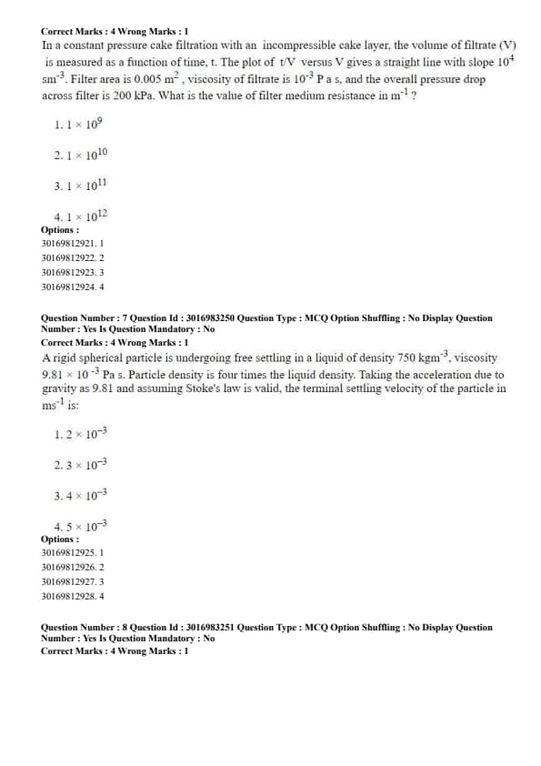 In a constant pressure cake filtration with an incompressible cake layer, the volume of filtrate (V) is measured as a function of time, t. The plot of \( \frac{t}{V} \) versus \( V \) gives a straight line with slope \( 10^4 \, sm^{-3} \). Filter area is \( 0.005 \, m^2 \), viscosity of filtrate is \( 10^{-3} \, Pa.s \), and the overall pressure drop across filter is \( 200 \, kPa \). What is the value of filter medium resistance in \( m^{-1} \)?