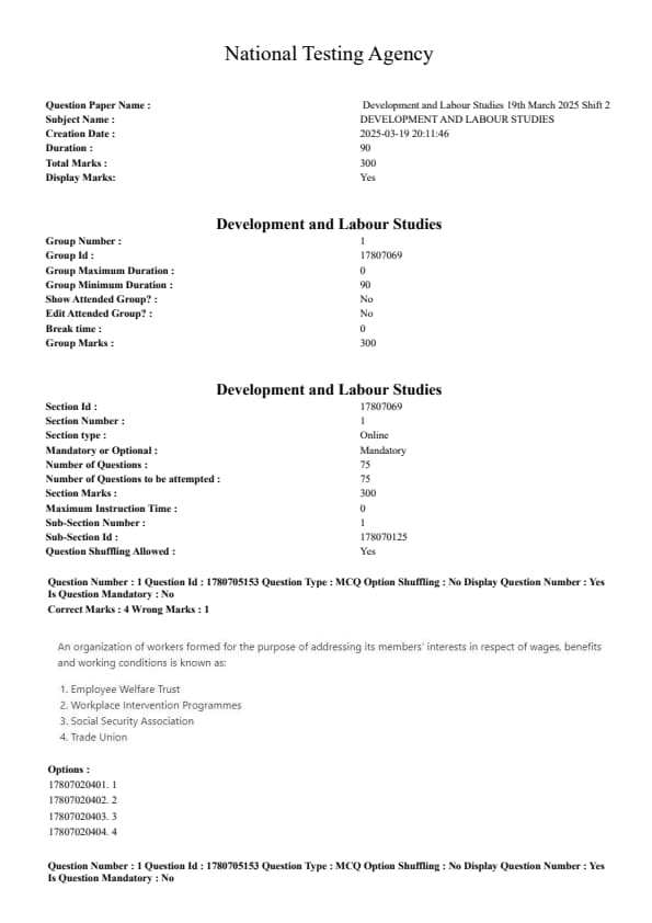 The CUET PG Development and Labour Studies 2025 exam was held on March 19, 2025, as per the official CUET PG schedule. Candidates will be able to download the official question paper, answer key, and solution PDFs once the exam concludes. The test covers topics such as development economics, labour policies, industrial relations, labour markets, gender and work, globalization, and labour laws.