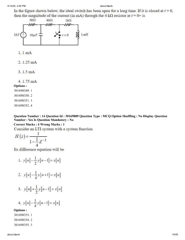 In the figure shown below, the ideal switch has been open for a long time. If it is closed at \(t=0\), then the magnitude of the current (in mA) through the 4 k\(\Omega\) resistor at \(t=0+\) is