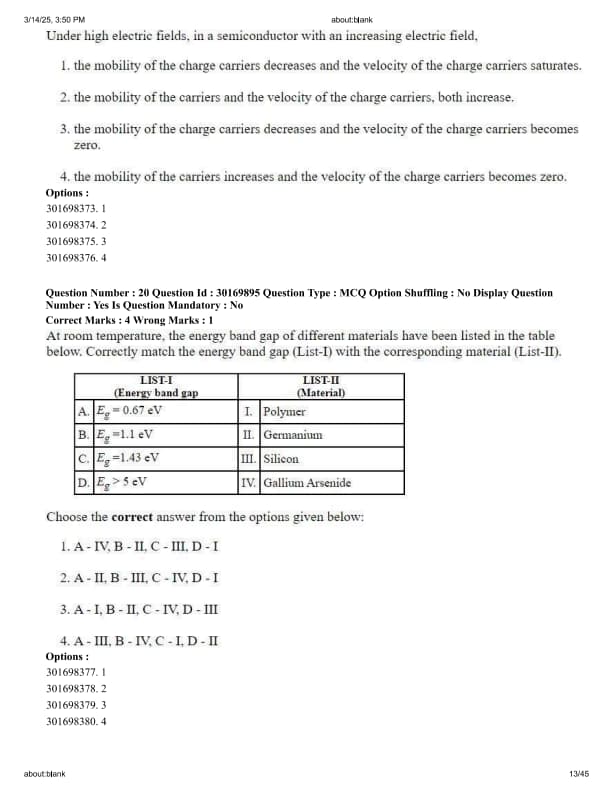 At room temperature, the energy band gap of different materials have been listed in the table below. Correctly match the energy band gap (List-I) with the corresponding material (List-II).
