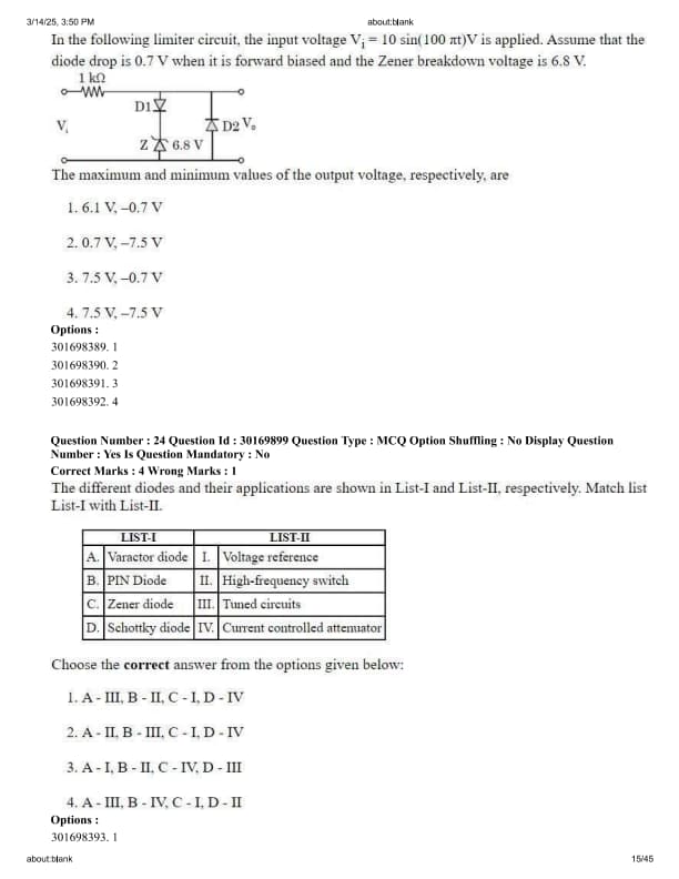The different diodes and their applications are shown in List-I and List-II, respectively.
