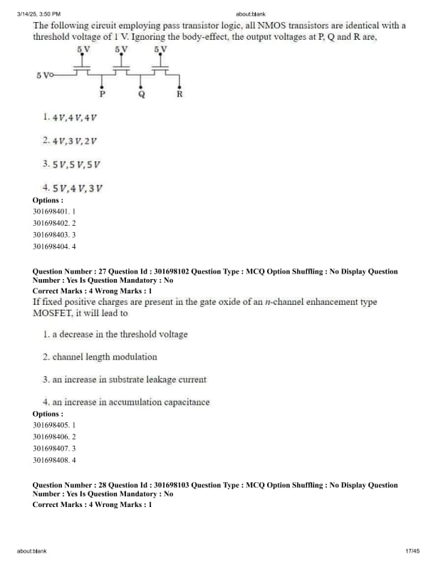 The following circuit employing pass transistor logic, all NMOS transistors are identical with a threshold voltage of 1 V. Ignoring the body-effect, the output voltages at P, Q and R are,