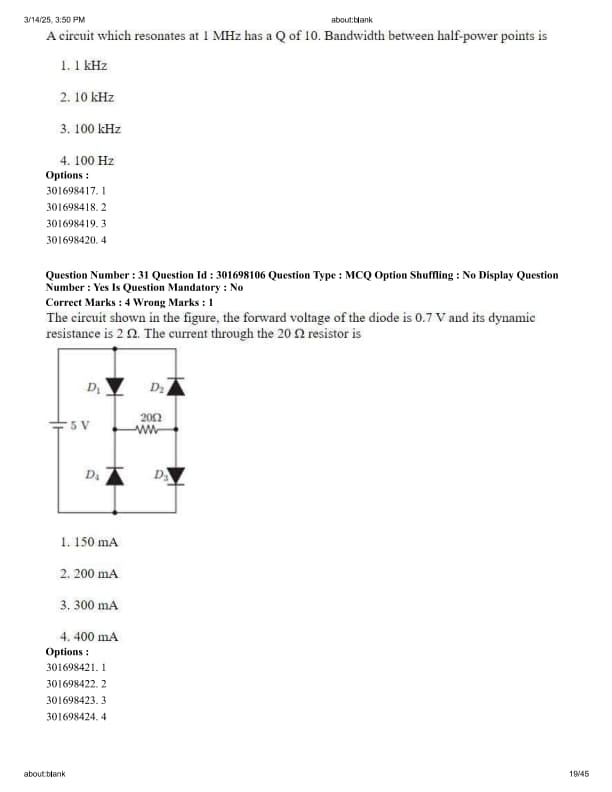 A circuit which resonates at 1 MHz has a Q of 10. Bandwidth between half-power points is