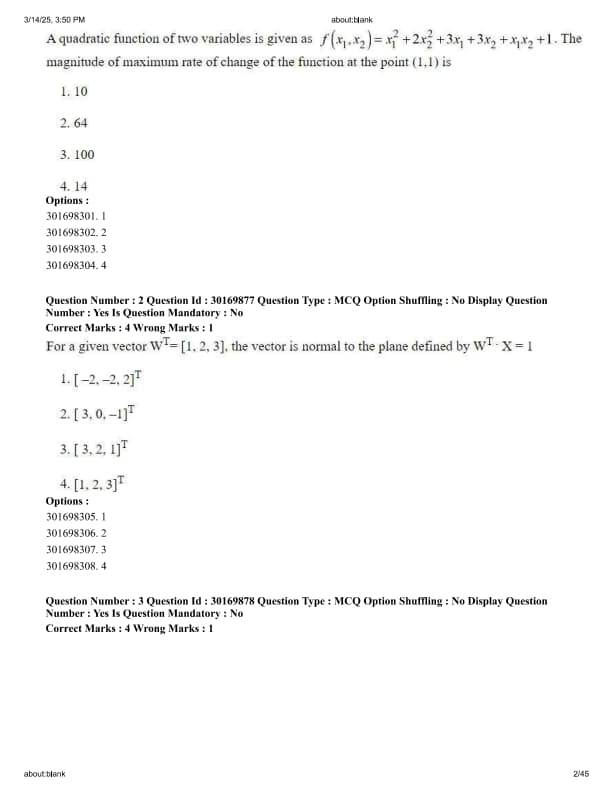 A quadratic function of two variables is given as \( f(x_1, x_2) = x_1^2 + 2x_2^2 + 3x_1 + 3x_2 + 1 \). The magnitude of maximum rate of change of the function at the point (1,1) is