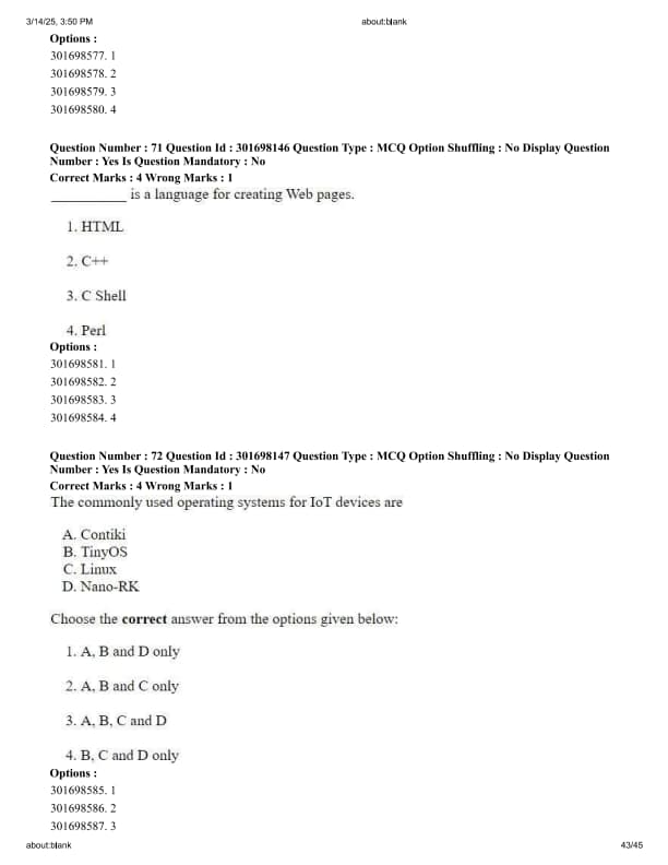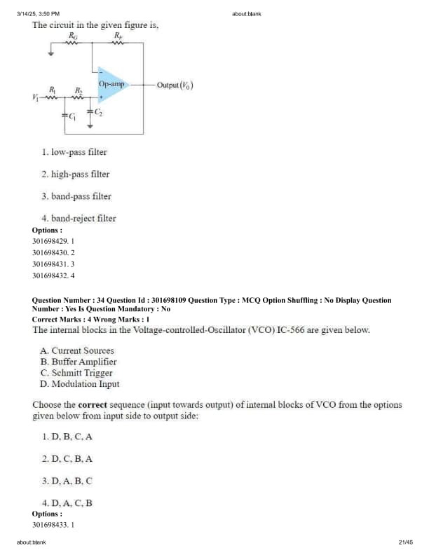 The internal blocks in the Voltage-controlled-Oscillator (VCO) IC-566 are given below. A. Current Sources, B. Buffer Amplifier, C. Schmitt Trigger, D. Modulation Input. Choose the correct sequence (input towards output) of internal blocks of VCO from the options given below from input side to output side: