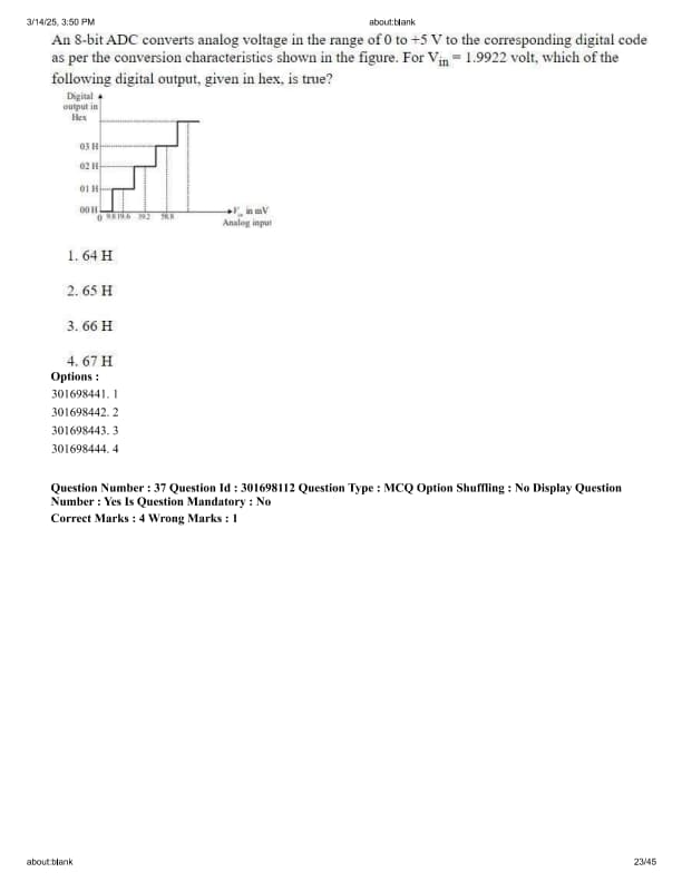 An 8-bit ADC converts analog voltage in the range of 0 to +5 V to the corresponding digital code as per the conversion characteristics shown in the figure. For \(V_{in}\) = 1.9922 volt, which of the following digital output, given in hex, is true?