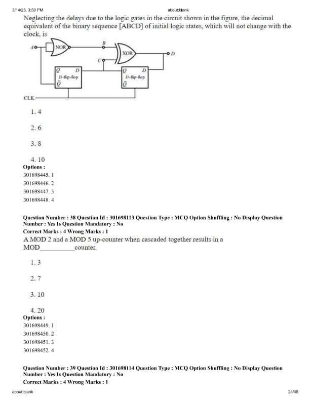 Neglecting the delays due to the logic gates in the circuit shown in the figure, the decimal equivalent of the binary sequence [ABCD] of initial logic states, which will not change with the clock, is