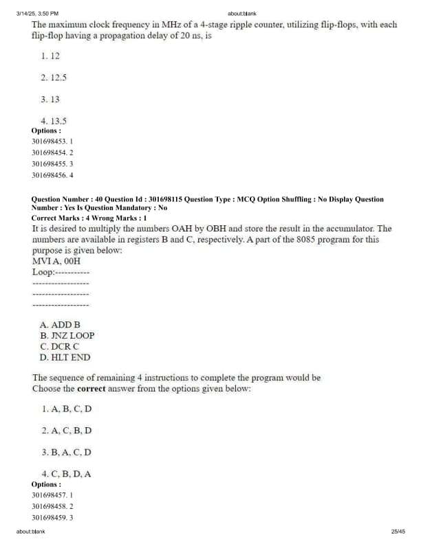 The maximum clock frequency in MHz of a 4-stage ripple counter, utilizing flip-flops, with each flip-flop having a propagation delay of 20 ns, is