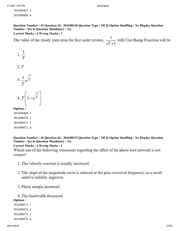 The value of the steady state error for first order system, \(\frac{1}{sT+1}\) with Unit Ramp Function will be