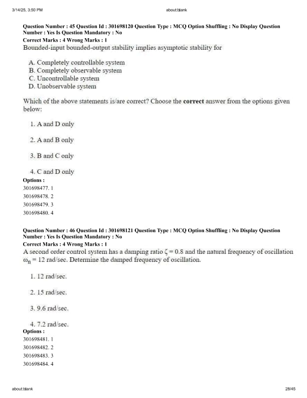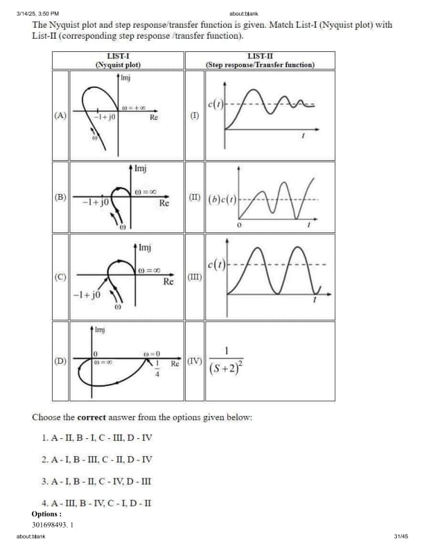The Nyquist plot and step response/transfer function is given. Match List-I (Nyquist plot) with List-II (corresponding step response/transfer function).