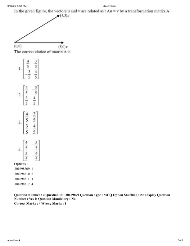In the given figure, the vectors u and v are related as \( Au = v \) by a transformation matrix A. The correct choice of matrix A is u = (4,3), v = (5,0)