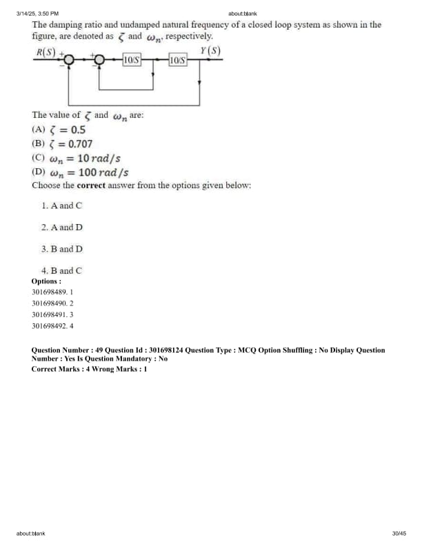 The damping ratio and undamped natural frequency of a closed loop system as shown in the figure, are denoted as \(\zeta\) and \(\omega_n\) respectively. The value of \(\zeta\) and \(\omega_n\) are: