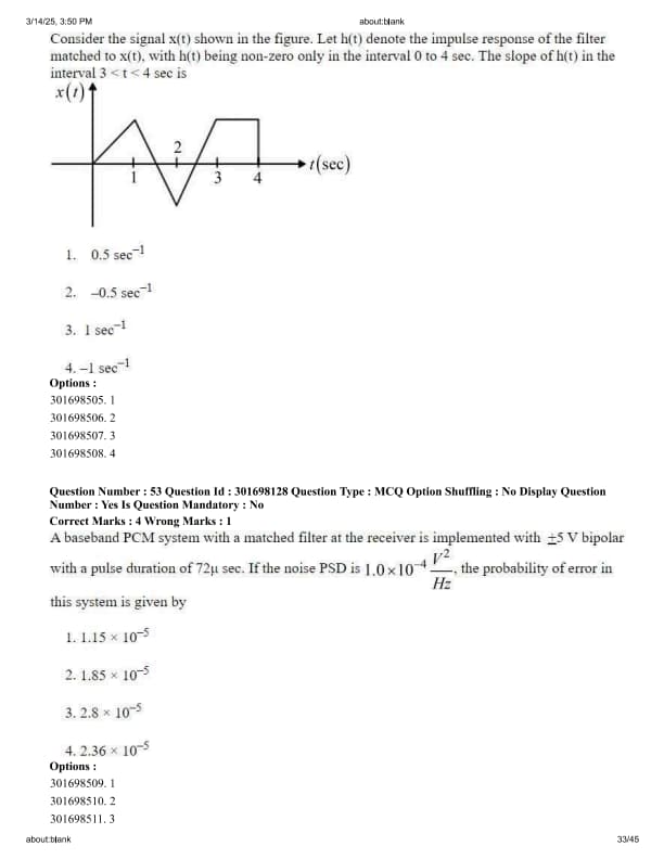 Consider the signal x(t) shown in the figure. Let h(t) denote the impulse response of the filter matched to x(t), with h(t) being non-zero only in the interval 0 to 4 sec. The slope of h(t) in the interval 3 greater than t greater than 4 sec is