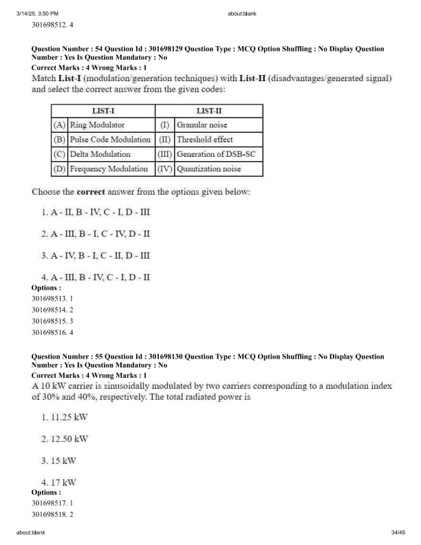 A 10 kW carrier is sinusoidally modulated by two carriers corresponding to a modulation index of 30% and 40%, respectively. The total radiated power is