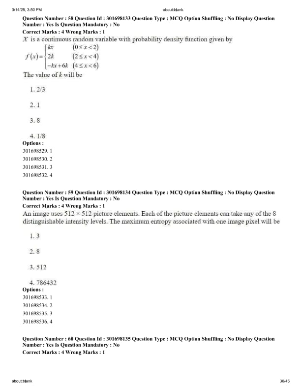An image uses \(512 \times 512\) picture elements. Each of the picture elements can take any of the 8 distinguishable intensity levels. The maximum entropy associated with one image pixel will be