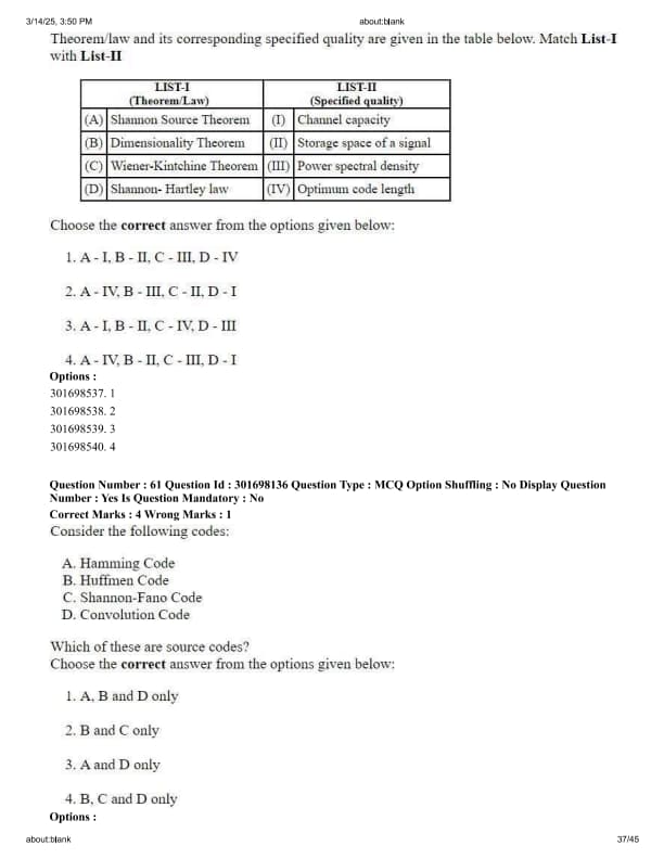 Consider the following codes: A. Hamming Code, B. Huffman Code, C. Shannon-Fano Code, D. Convolution Code. Which of these are source codes?