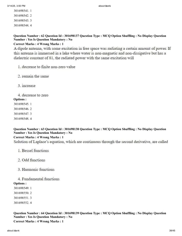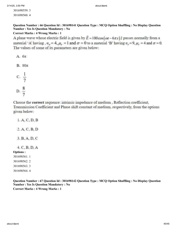 Choose the correct sequence: intrinsic impedance of medium B, Reflection coefficient, Transmission Coefficient and Phase shift constant of medium B, respectively, from the options given below: