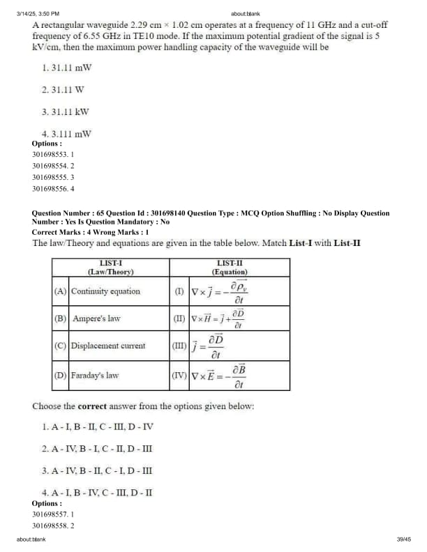 A rectangular waveguide 2.29 cm \(\times\) 1.02 cm operates at a frequency of 11 GHz and a cut-off frequency of 6.55 GHz in TE10 mode. If the maximum potential gradient of the signal is 5 kV/cm, then the maximum power handling capacity of the waveguide will be