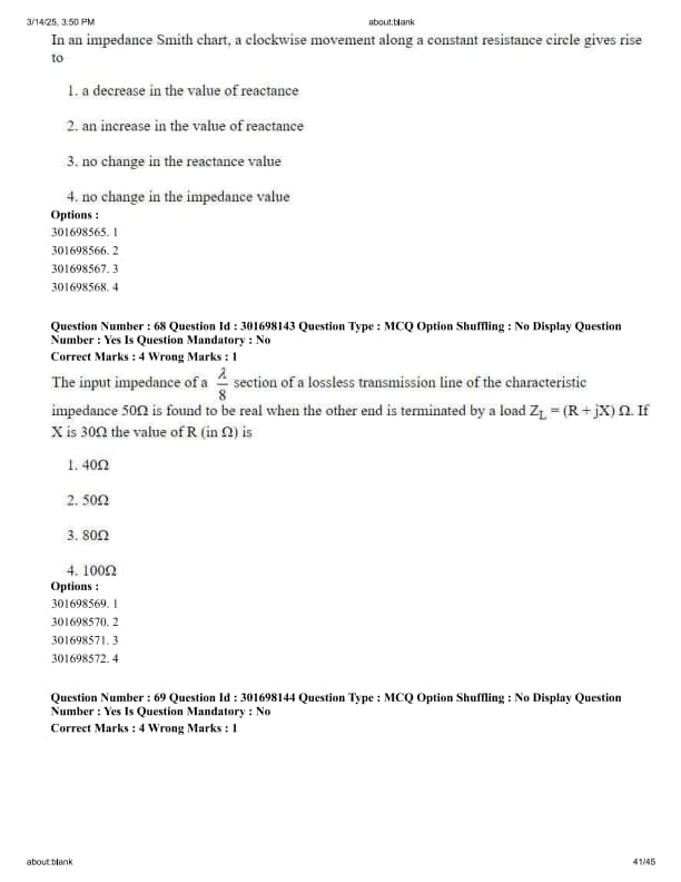 The input impedance of a \(\frac{\lambda}{8}\) section of a lossless transmission line of the characteristic impedance \(50\Omega\) is found to be real when the other end is terminated by a load \(Z_L = (R + jX)\Omega\). If \(X\) is \(30\Omega\) the value of R (in \(\Omega\)) is