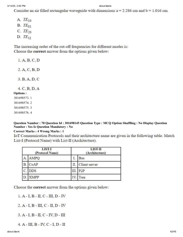 IoT Communication Protocols and their architecture name are given in the following table. Match List-I (Protocol Name) with List-II (Architecture).