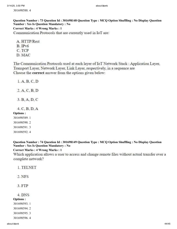 The Communication Protocols used at each layer of IoT Network Stack: Application Layer, Transport Layer, Network Layer, Link Layer, respectively, in a sequence are