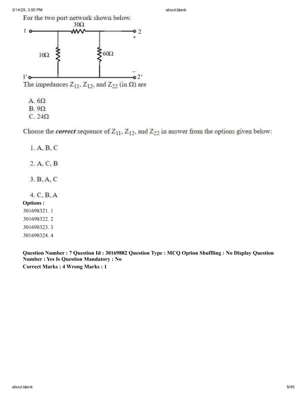 A. \(6\Omega\), B. \(9\Omega\), C. \(24\Omega\). Choose the correct sequence of \(Z_{11}, Z_{12}, Z_{22}\) in answer from the options given below: