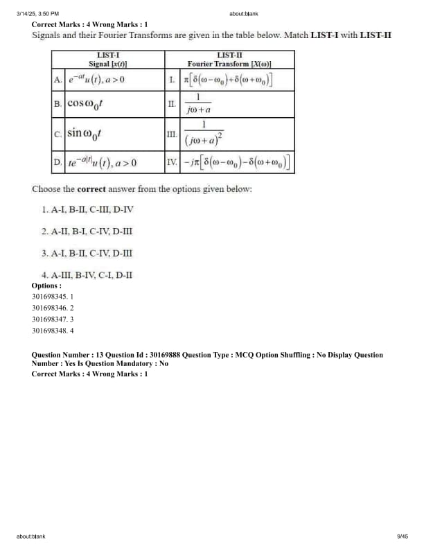Signals and their Fourier Transforms are given in the table below. Match LIST-I with LIST-II and choose the correct answer.