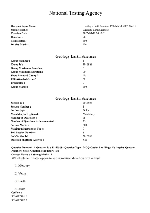 CUET PG Geology Earth Sciences Question Paper 2025 will be available here for download. NTA conducted CUET PG Geology Earth Sciences paper 2025 on from March 19 in Shift 3. CUET PG Question Paper 2025 is based on objective-type questions (MCQs). According to latest exam pattern, candidates get 90 minutes to solve 75 MCQs in CUET PG 2025 Geology Earth Sciences question paper.