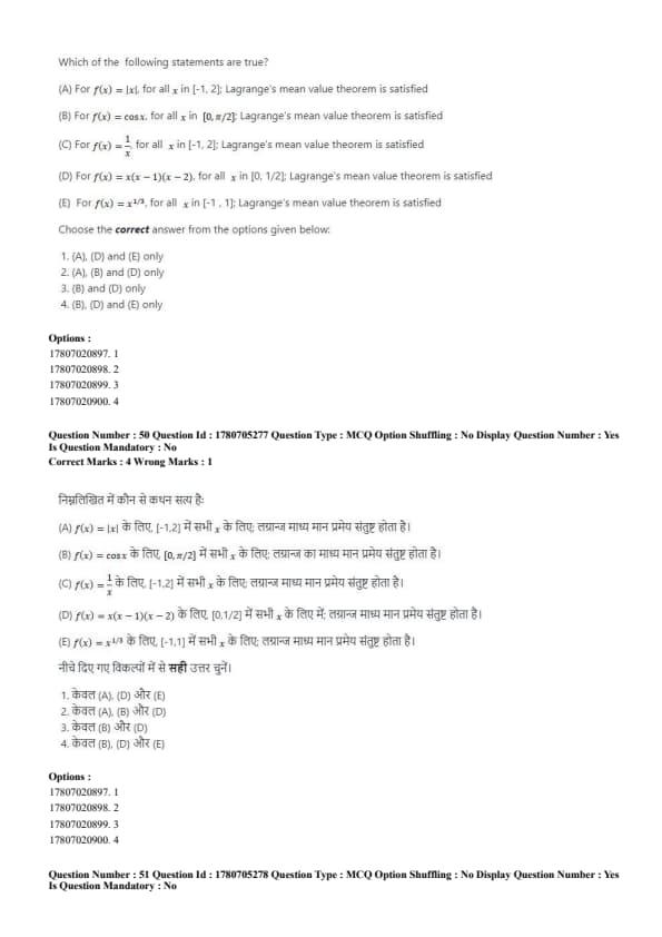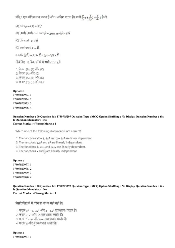 Quick Tip: To quickly test linear independence, consider if one function can be written as a linear combination of the others. In (A), you can see that \(2(x^2-1) + 1(3x^2) = 5x^2-2\), which is \(-1 \times (2-5x^2)\). So \(2f_1 + f_2 + f_3 = 0\). For (C), it's impossible to write, for example, \(\sin x\) as \(c_1(1) + c_2(\cos x)\) for all x.