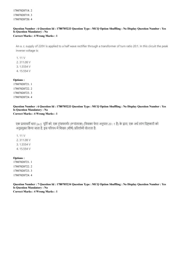 Quick Tip: Always be careful whether the given AC voltage is an RMS value or a peak value. In standard practice (like mains supply), the value given (e.g., 220V, 110V) is always the RMS value unless specified otherwise. Remember PIV values for standard rectifiers: Half-wave: PIV = \(V_{s,peak}\) Full-wave (center-tapped): PIV = \(2V_{s,peak}\) (where \(V_{s,peak}\) is across half the secondary) Full-wave (bridge): PIV = \(V_{s,peak}\)