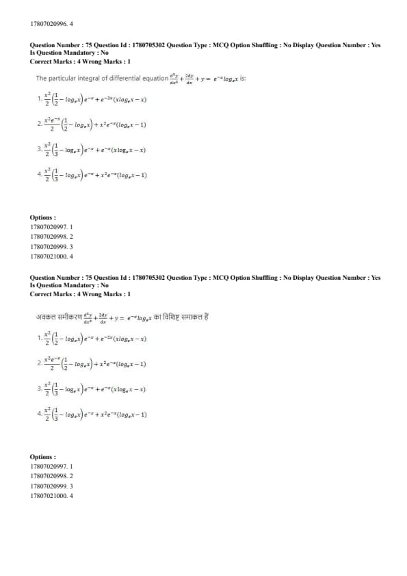 The derived solution is in its simplest form. The options are not. We must simplify the correct option to see if it matches our result. Let's simplify option (B): \[ \frac{x^2e^{-x}}{2}\left(\frac{1}{2}-\log_e x\right) + x^2e^{-x}(\log_e x - 1) \] \[ = \left(\frac{x^2e^{-x}}{4} - \frac{x^2e^{-x}}{2}\log x\right) + (x^2e^{-x}\log x - x^2e^{-x}) \]