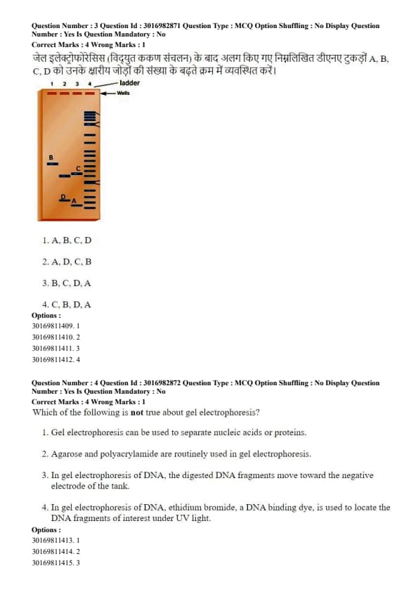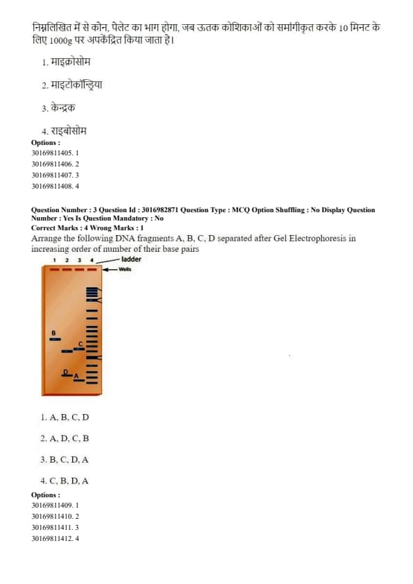 Arrange the following DNA fragments A, B, C, D separated after Gel Electrophoresis in increasing order of number of their base pairs