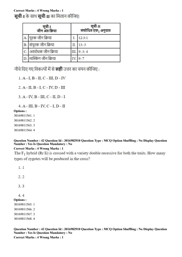 The F\(_1\) hybrid (Rr Ii) is crossed with a variety double recessive for both the traits. How many types of zygotes will be produced in the cross?