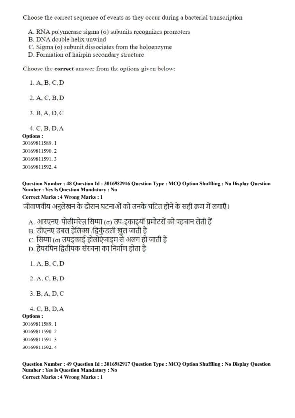 Choose the correct sequence of events as they occur during a bacterial transcription