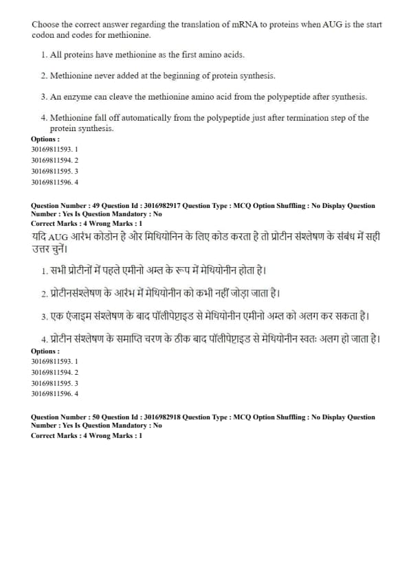 Choose the correct answer regarding the translation of mRNA to proteins when AUG is the start codon and codes for methionine.