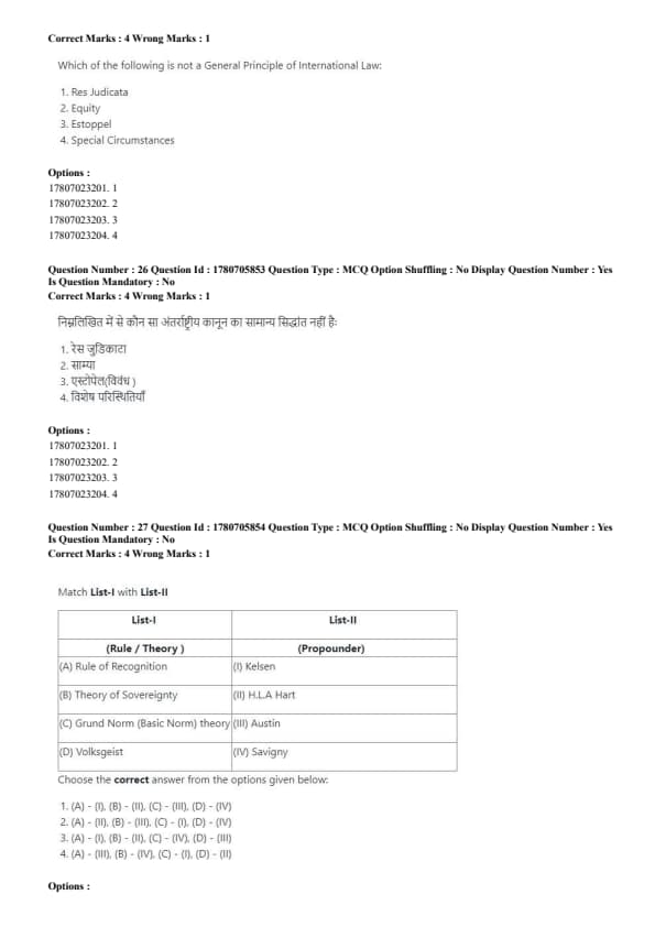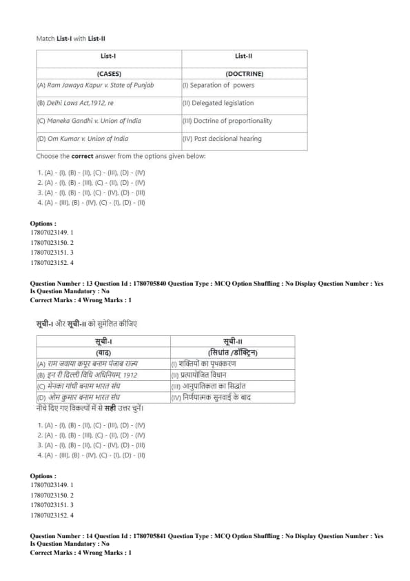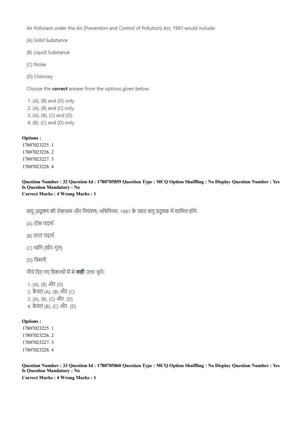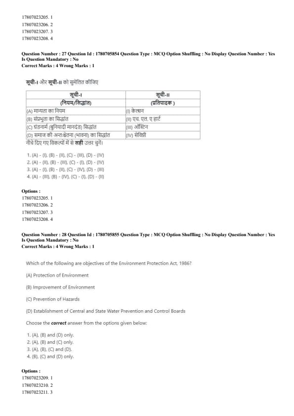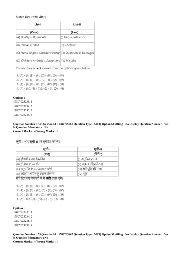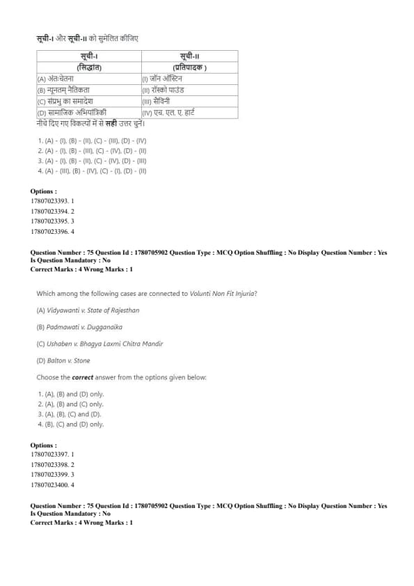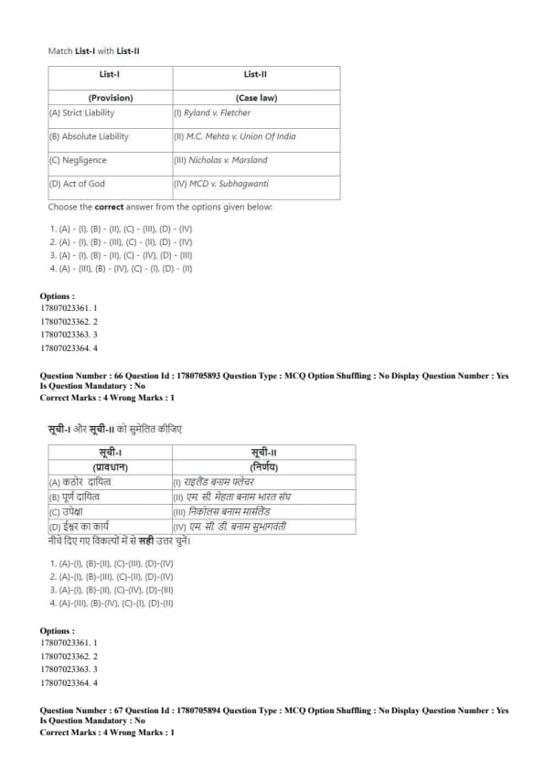 - Correct matching: (A)-(1), (B)-(II), (C)-(III), (D)-(IV). Quick Tip: Strict liability holds a person accountable for damages, even without fault, while absolute liability eliminates exceptions for hazardous activities.