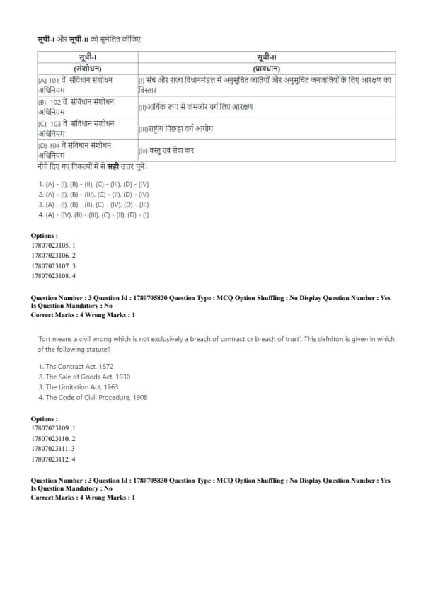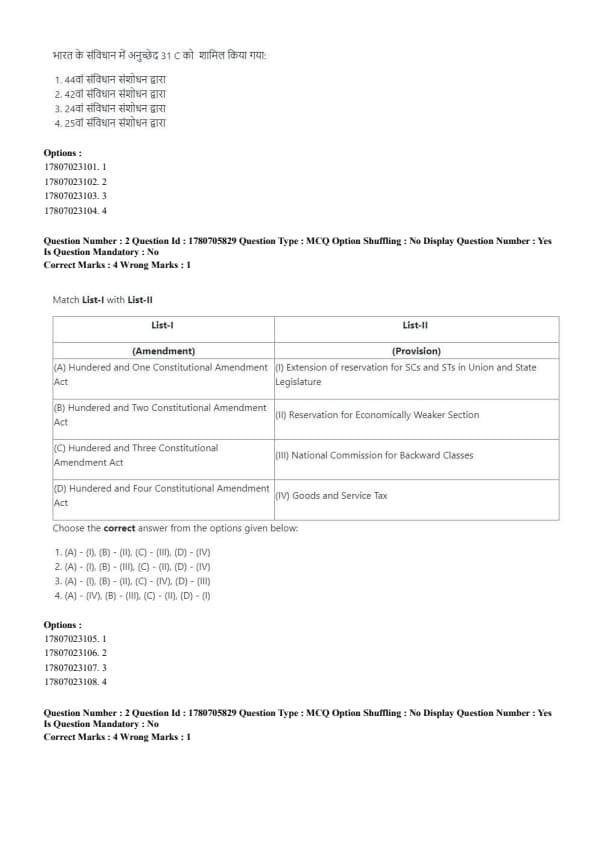 - (D) Hundred and Four Constitutional Amendment Act → (IV) Goods and Service Tax Quick Tip: The Hundred and One Amendment extended the reservation for SCs/STs, while other amendments focused on specific commissions and economic reforms.