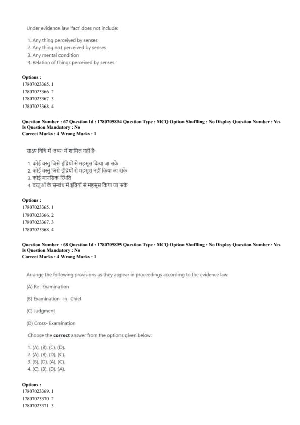 - According to evidence law, the correct order of examination is: (B) Examination-in-Chief, (D) Cross-Examination, (A) Re-Examination, and (C) Judgment.