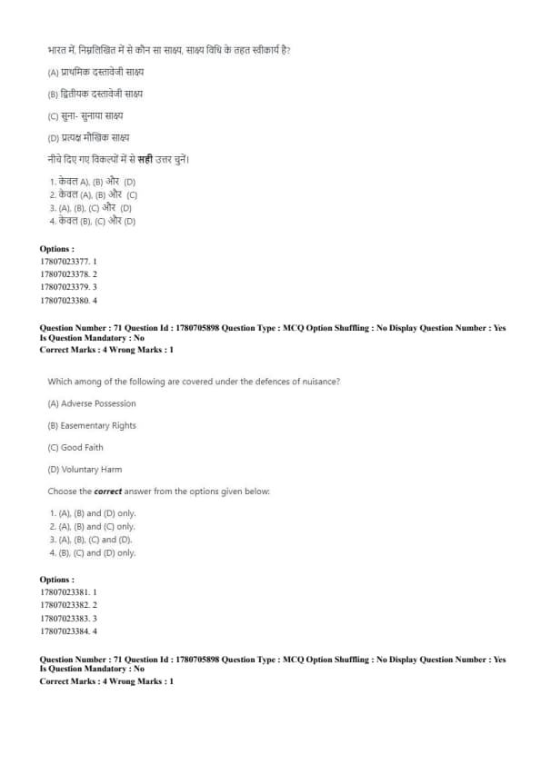 The correct answer is (A), (B) and (D) only. Quick Tip: In nuisance cases, defences such as adverse possession and easementary rights are commonly accepted, while voluntary harm is not.